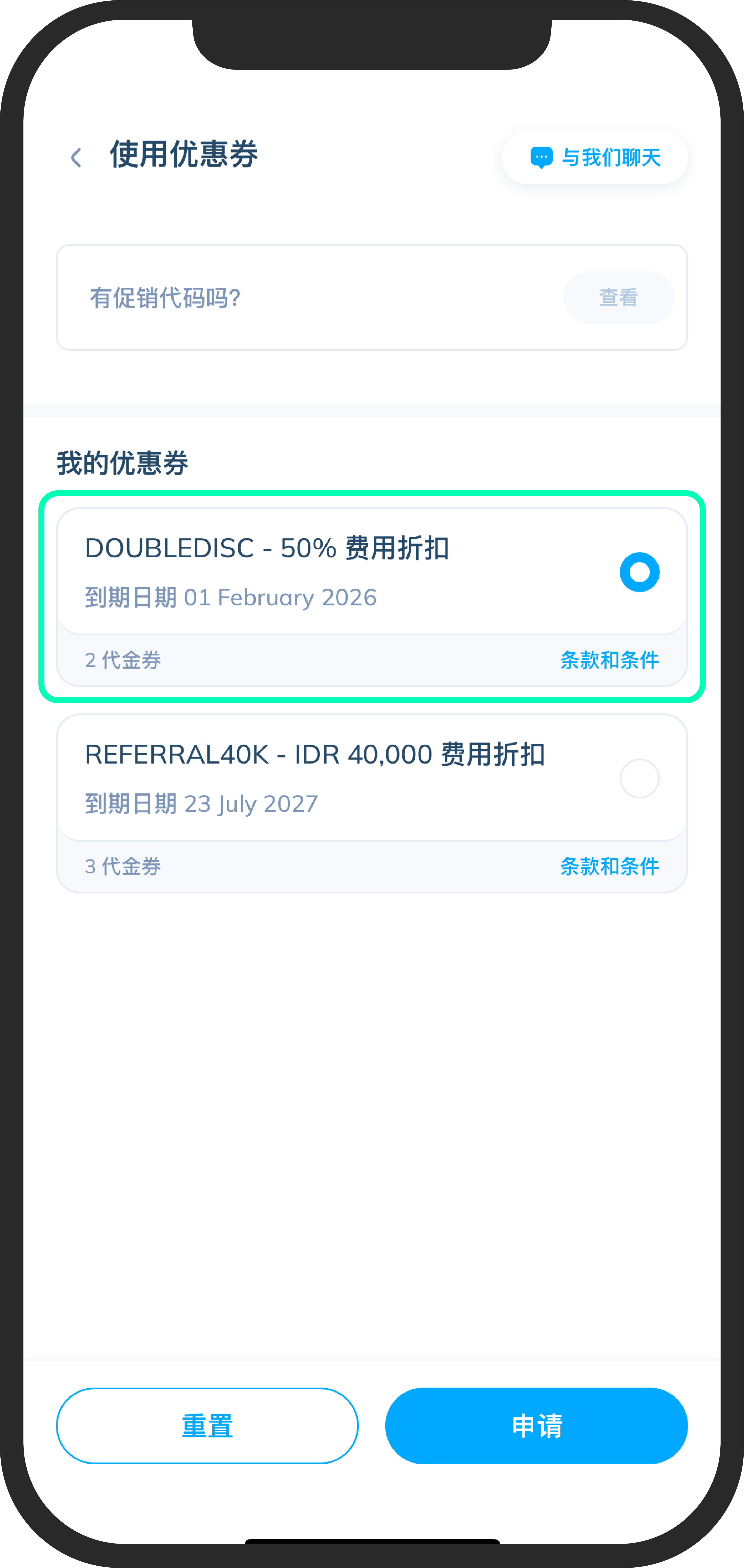 - 接下来,选择您想使用的优惠券。您可以从帐户中可用的优惠券列表中选择,或输入促销代码以兑换折扣。完成后,您的汇款手续费将自动享折扣