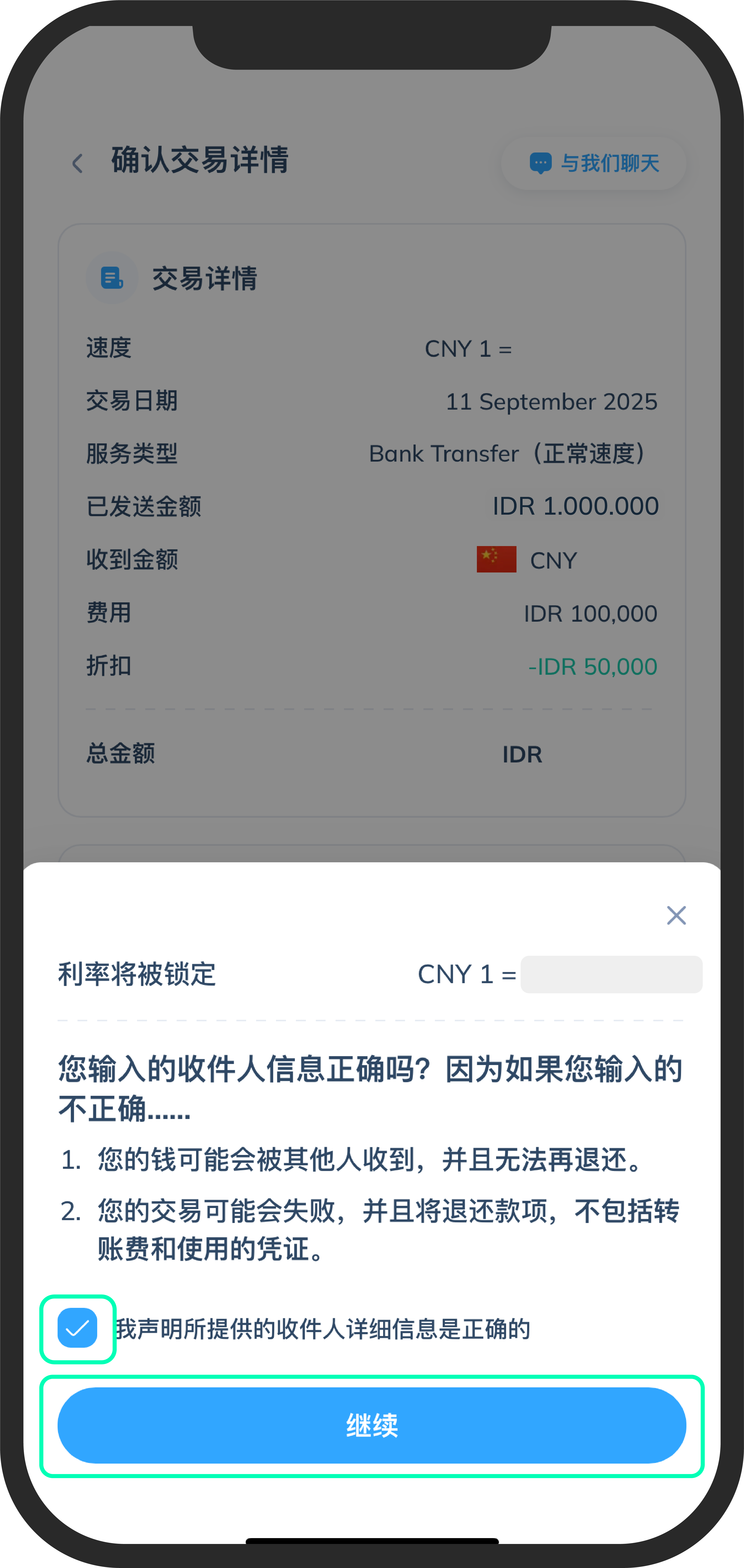 - 点击“继续”确认交易信息。然后勾选声明框,再点击“继续”