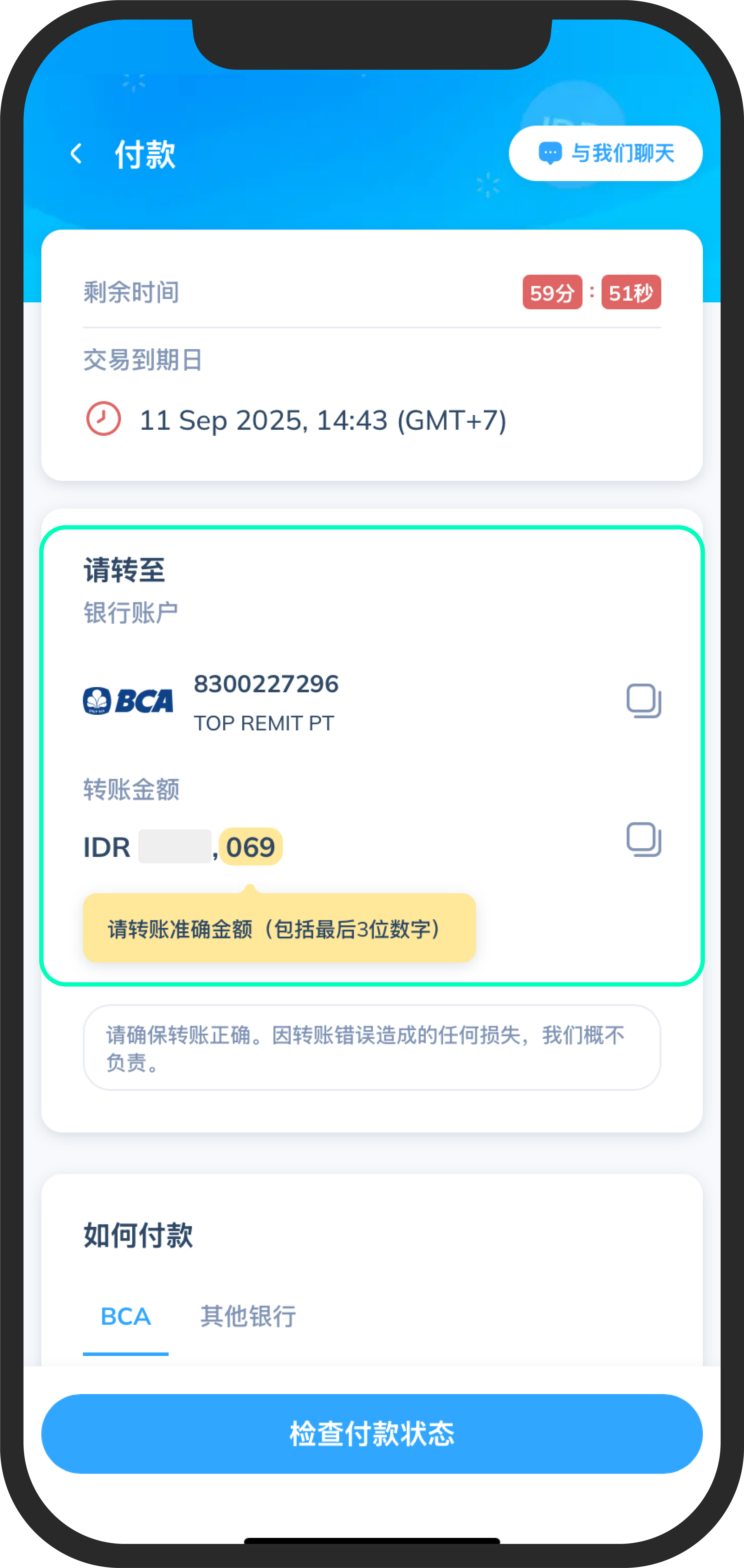 请确保您汇出的金额正确(包括最后三位数字)